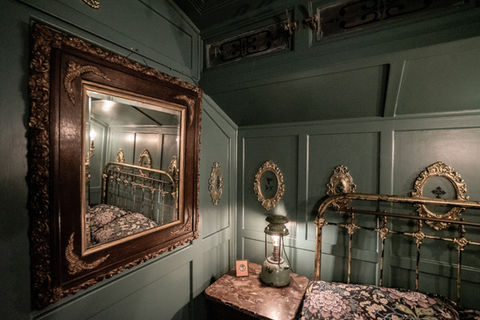 The Circus Wagon is an original 1920s showman’s wagon, once home to a bare knuckle fighter travelling with J. Prestney’s circus. Restored and styled in an opulent, romantic fashion, it transports guests back in time with chandeliers, gold leaf details, and antique furnishings. Set within the meadows and woodland of our family farm, the wagon includes a cosy bedroom, lounge with record player, and a decadent dressing room. It offers couples an atmospheric escape, rich with history and charm.
